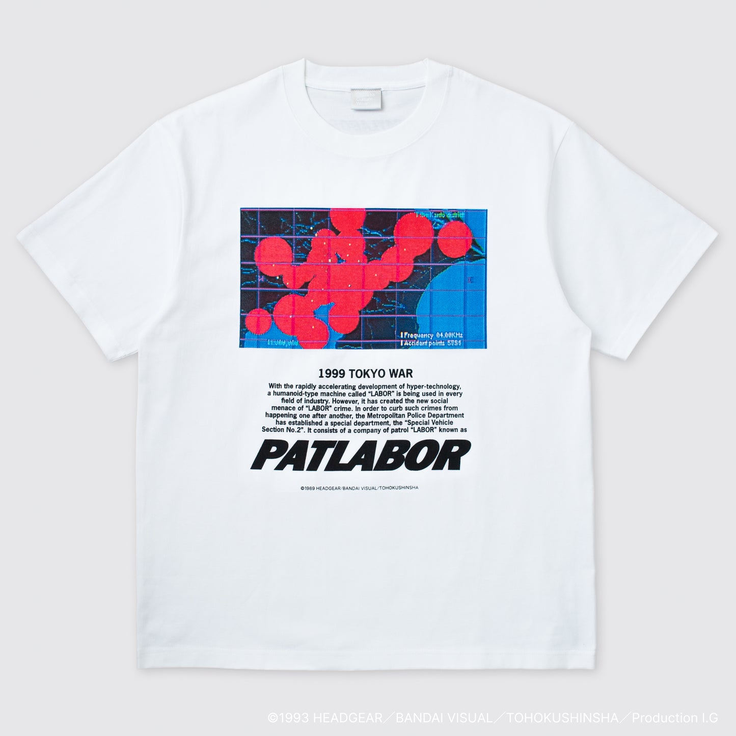 Tシャツは『機動警察パトレイバー 劇場版』のキーとなるシーンで登場する、湾岸の異常波形を示すマップ映像を大胆に落とし込んだグラフィックTシャツ。英字は劇場版ポスターに使用されたコピーをモチーフにデザインしました。6.8オンスのヘビーウェイトボディを使用し、耐久性がありながらも着込むほどに肌になじむ仕上がり。サイロスパン糸によるクリアで滑らかな生地感も特徴的で、作品の熱量を日常に纏う一枚となっています。
