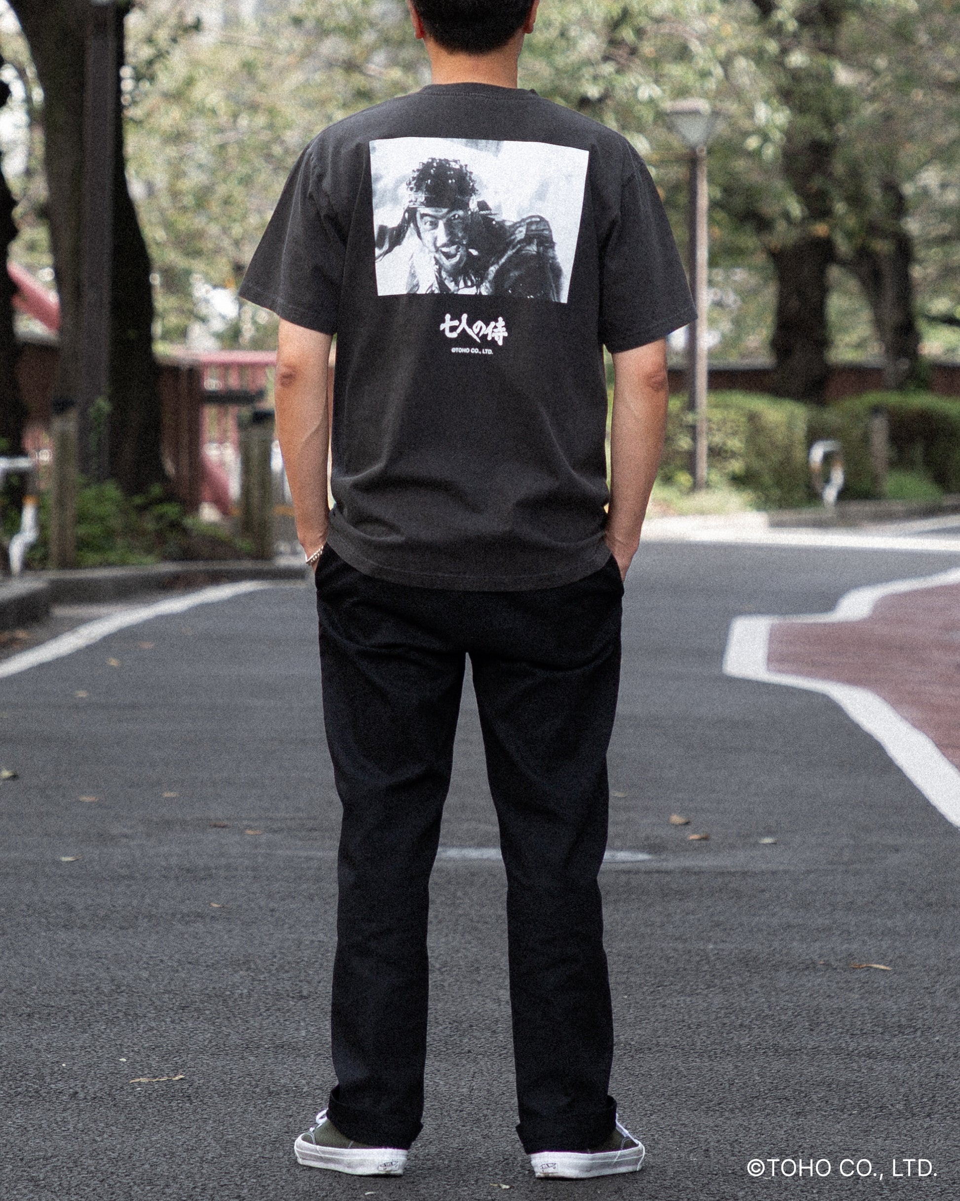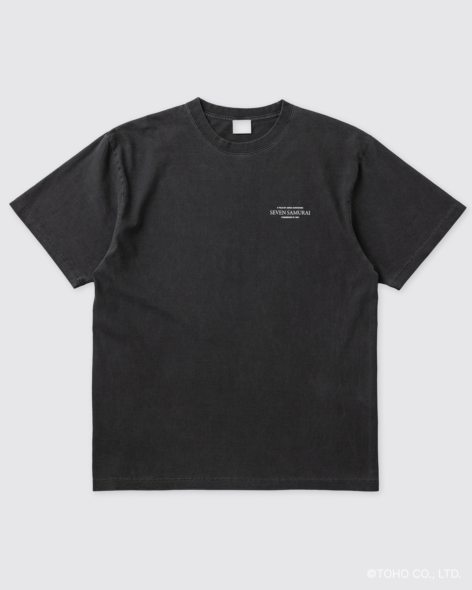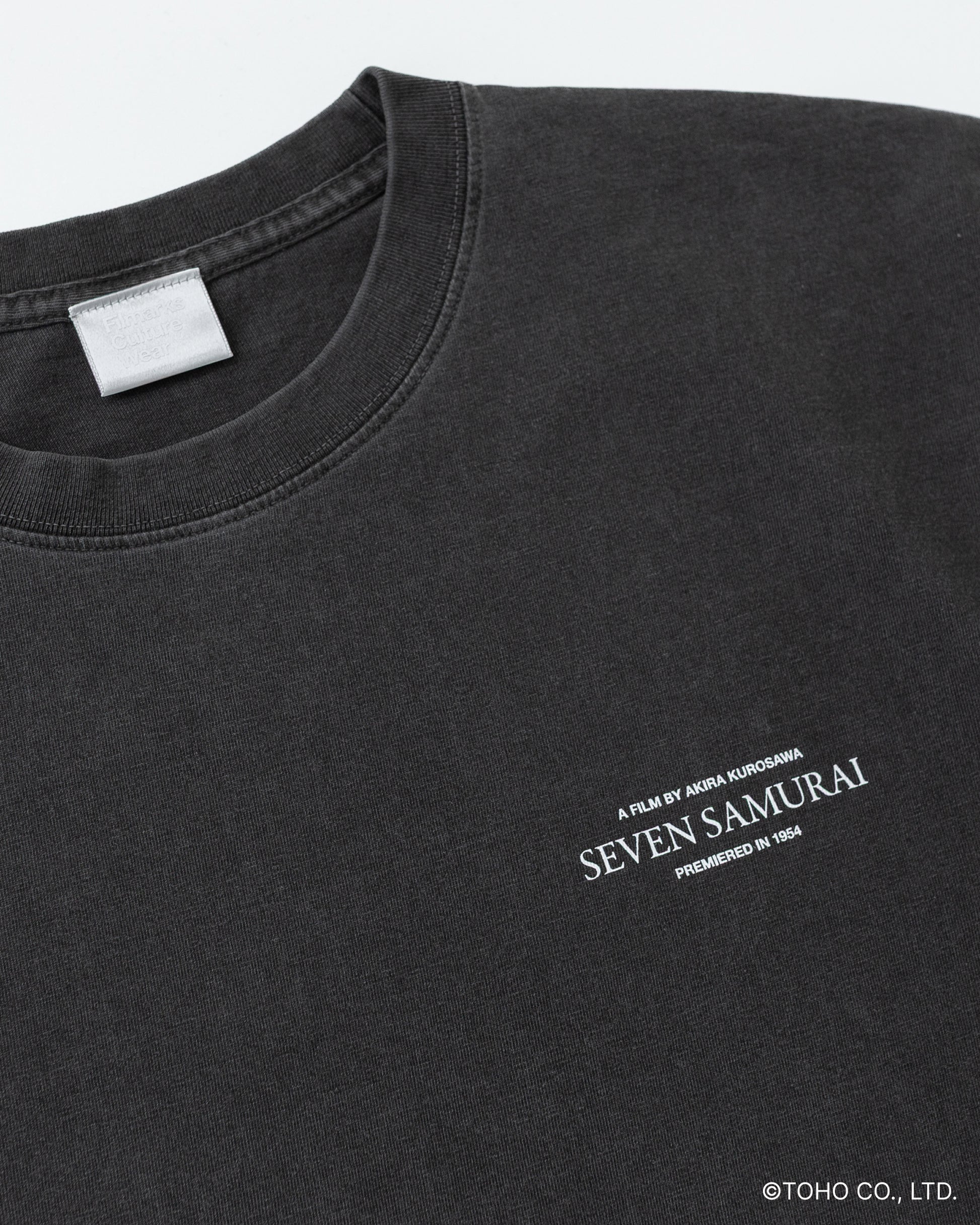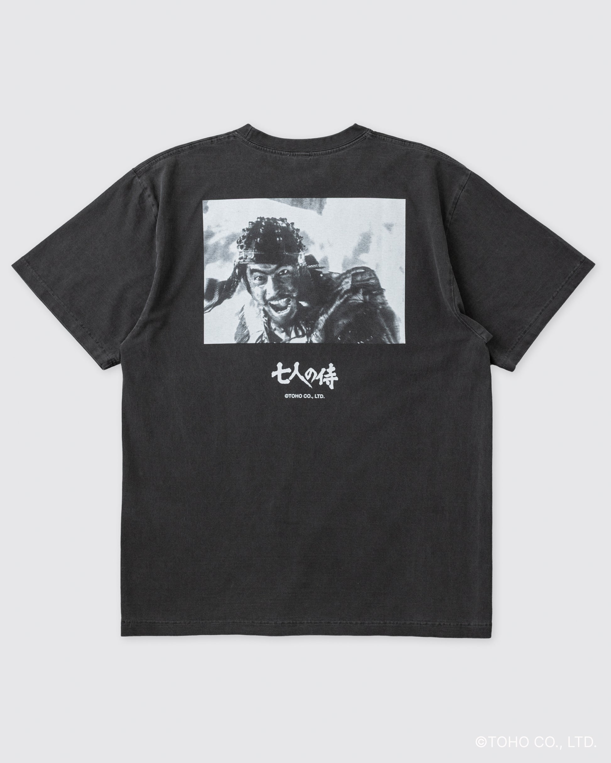 こちらの菊千代Tのフロントの胸元には、作品の英字タイトル「SEVEN SAMURAI」とクレジットをシンプルにデザイン。 バックには、三船敏郎が演じる破天荒な侍・菊千代の印象的なワンカットを大胆にプリントしました。その迫力と躍動感にあふれるプリントの下に添えた『七人の侍』のロゴが、静かに存在感を放ちます。